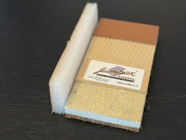 Dit is een ondervloer met een onderste laag van kokos – dat weert het geluid naar beneden. Tussen muur en vloer brengen we ook geluidswering aan.